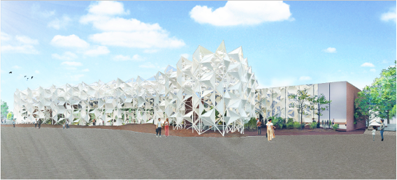 (仮称)屋内出展施設には、2020年ドバイ国際博覧会の日本館で使用されたのち、2025年の大阪・関西万博の「ウーマンズ パビリオン in collaboration with Cartier」でも使用されたファサード資材がリユースされます。