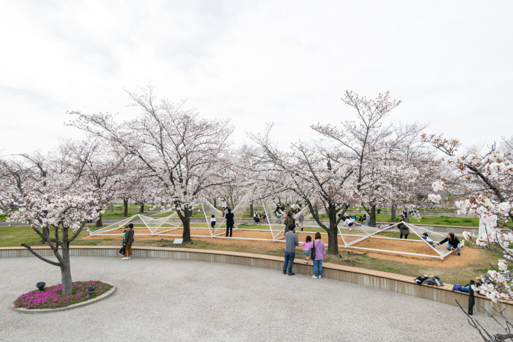 シーティングスペースに設置したテラゾーベンチは、求心性と座り心地を重視した丸みのある柔らかな形状とし、グリッド性の強い共用通路の中に新たな居場所を生み出している。仕上げに使用したテラゾーの骨材には、製造過程で余った大理石の端材や、能登半島地震で割れ商品化できなかった九谷焼の陶片を混ぜ、アップサイクルを試みた。 さらに植栽は、高さや樹形の変化を活かした配置によって立体的な視認性を持たせ、自由な区画の中に豊かな奥行きを与えている。樹種は二子玉川の緑を想起させるものを選び、加えて季節ごとに変化する草花を組み合わせることで、四季の移ろいを感じられる空間としている。